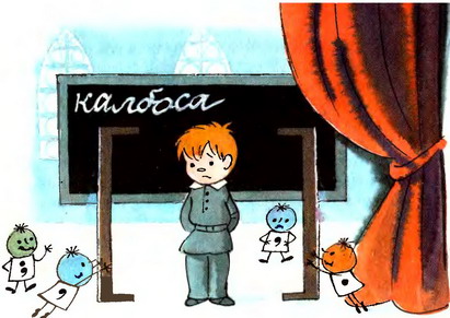 — Хорошо, — согласился Глагол и махнул рукой. На черной доске исчезло слово «собака» и появилось слово "со. нце".