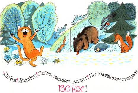 Из лесу выбежали звери. Они вволю напились воды. Зайцы прыгали и кувыркались. Лисы махали рыжими хвостами. Белки скакали по веткам. Ежи катались, как мячики. А птицы стрекотали так оглушительно, что я не мог понять ни слова из всей их болтовни. Моего кота охватил телячий восторг. Можно было подумать, что он нализался валерьянки.