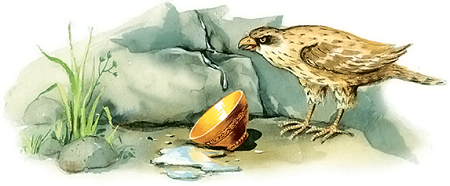Сокол поймал зайца. Царь отнял зайца и стал искать воды, где бы напиться. В бугре царь нашел воду. Только она по капле капала. Вот царь достал чашу с седла и подставил под воду. Вода текла по капле, и когда чаша набралась полная, царь поднял ее ко рту и хотел пить. Вдруг сокол встрепенулся на руке у царя, забил крыльями и выплеснул воду. Царь опять подставил чашу. Он долго ждал, пока она наберется вровень с краями, и опять, когда он стал подносить ее ко рту, сокол затрепыхался и разлил воду.