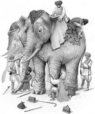 Один индийский царь велел собрать всех слепых и, когда они пришли, велел им показать своих слонов. Слепые пошли в конюшню и стали щупать слонов.