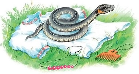 Из воды выполз большой уж и, свернувшись, лёг на Машину рубашку. Девочки вылезли из воды, надели свои рубашки и побежали домой. Когда Маша подошла к своей рубашке и увидала, что на ней лежит ужак, она взяла палку и хотела согнать его; но уж поднял голову и засипел человечьим голосом: