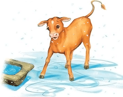 Телёнок скакал по закуте и выучился делать круги и повороты. Когда пришла зима, теленка выпустили с другою скотиною на лёд к водопою. Все коровы осторожно подошли к корыту, а телёнок разбежался на лёд, загнул хвост, приложил уши и стал кружиться. На первом же кругу нога его раскатилась, и он ударился головою о корыто.