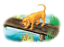 Собака шла по дощечке через речку, а в зубах несла мясо. Увидала она себя в воде и подумала, что там другая собака мясо несет, — она бросила свое мясо и кинулась отнимать у той собаки: того мяса вовсе не было, а свое волною унесло.