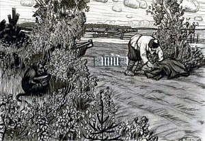 Испугался чертенок, побежал на землю, стал придумывать, как свою вину заслужить. Думал, думал и придумал. Обернулся чертенок добрым человеком и пошел к бедному мужику в работники. И научил он мужика в сухое лето посеять хлеб в болоте. Послушался мужик работника, посеял в болоте.