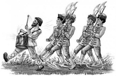 Показала жена ему дорогу. Пошел Емельян, вышел за город, видит — солдаты учатся. Постоял, посмотрел Емельян. Поучились солдаты, сели отдохнуть. Подошел к ним Емельян и спрашивает: